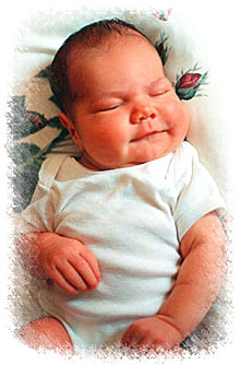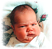 As time went on they saw more and more of the head, and with each contraction the cheers and accolades got louder and more excited--it should come out at any moment. The head was half way out for about the last hour and just wouldn't budge. They tried several positions. (At one point it went almost all the way back in! Luckily it came right back out again on the next contraction). At about 6:00 Ginny was on hands and knees and the Midwife had decided that it was time to give in and try a small episiotomy-- something she really didn't want to do (she was hoping for a small tear so that she wouldn't have to cut and it would heal better). Ginny was actually just starting to turn over when another contraction came. She stayed in that position to push with the contraction when finally the head made it through! A small tear had finally allowed the head just enough room to get through. With the next contraction the rest of the body came through and the boy with no name was born. After the birth the baby was placed in the arms of his elated mother. After about fifteen minutes he began to nurse. The next day Ginny recalled that throughout the five hours of pushing she didn't really feel any pain, and the thought of using pain drugs never entered her mind. She felt exhaustion, fatigue, and constantly felt like she didn't have the strength to push any longer--but didn't feel pain until the head and body actually came through. Ginny stayed in the hospital for two days to allow her muscles to recover. The baby stayed in the room with mom and dad the entire two days and was never without loving contact with his parents and relatives. |